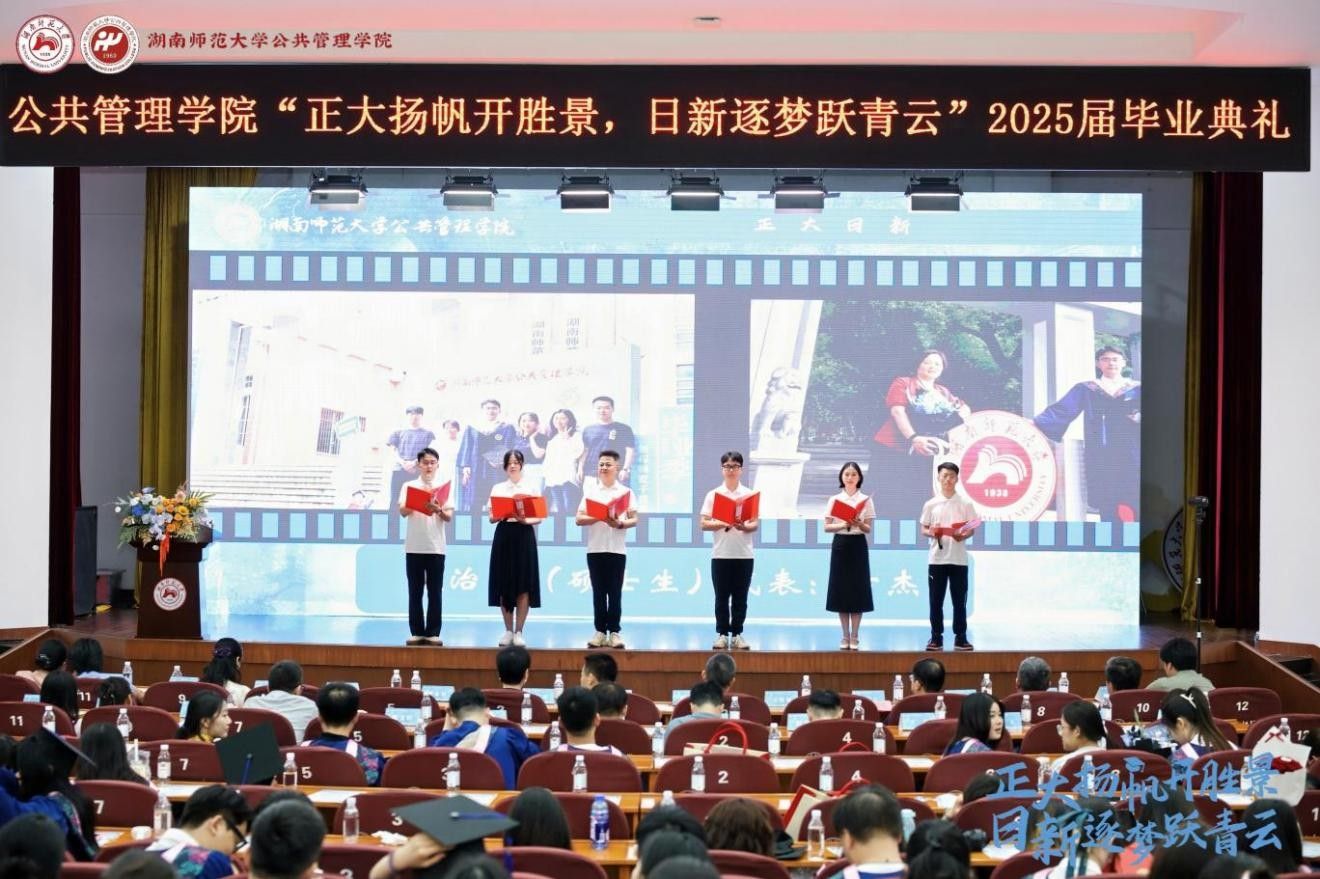 (通讯员 盛若水 周涵韵)6月9日下午,beat365的官方网站2025届毕业典礼于国际学术报告厅隆重举行。学校招生与就业指导处处长田野,党校常务副校长袁道香,校友总会秘书长黄丽萍,研究生院副院长、学位办副主任邹永星,关工委副秘书长、离退休工作处副处长方俊雄,beat365院党委书记余望成,院长毛新志,党委副书记陈丽荣,副院长王敏、苏静、胡雪松,道德文化研究院副院长文贤庆,副处级校友专员邝洁,院工会主席赵玉燕及各学位点负责人、学生导师和行政教辅老师受邀出席。典礼仪式由余望成主持。